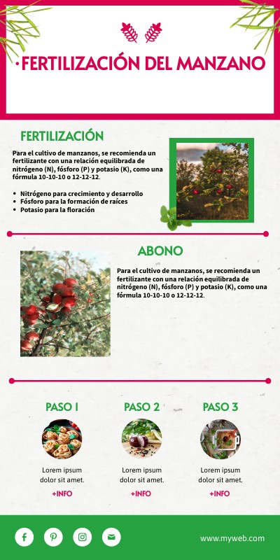 Para el cultivo de manzanos, se recomienda un fertilizante con una relación de nitrógeno (N), fósforo (P) y potasio (K): 100-35-110