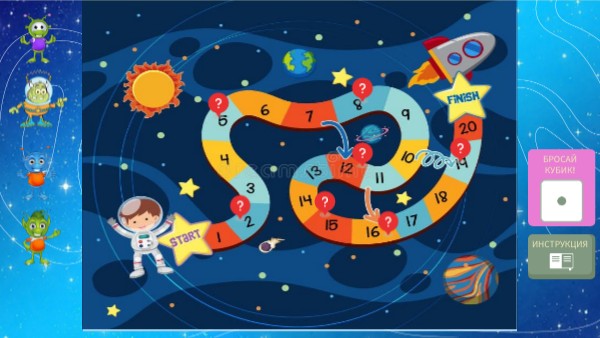 Поставь фигурку на старт. Расстояние, на которое можно передвинуть фигурку определяется броском интерактивного кубика. При попадании на клеточку со знаком "вопрос" игрок выполняет задание. Если выполнил задание правильно, то передвигает фигурку на два хода вперед дополнительно. Если неправильно, то пропускает ход. Если игрок попадает на клеточку, где начитается стрелка, тот передвигает фигурку по направлению стрелки.
