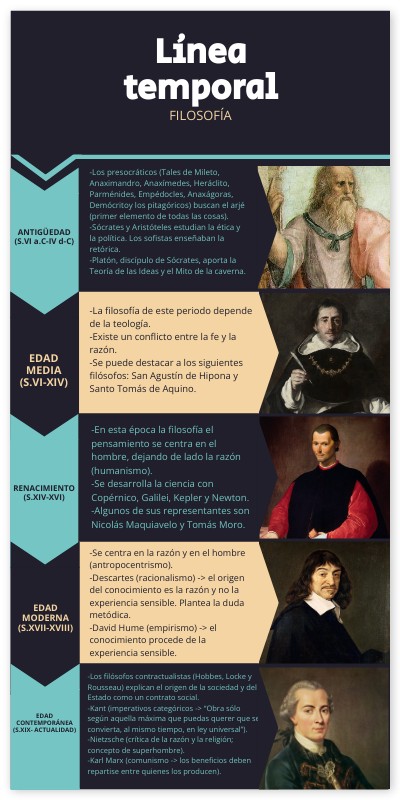 -Los presocráticos (Tales de Mileto, Anaximandro, Anaxímedes, Heráclito, Parménides, Empédocles, Anaxágoras, Demócritoy los pitagóricos) buscan el arjé (primer elemento de todas las cosas).-Sócrates y Aristóteles estudian la ética y la política. Los sofistas enseñaban la retórica. -Platón, discípulo de Sócrates, aporta la Teoría de las Ideas y el Mito de la caverna.