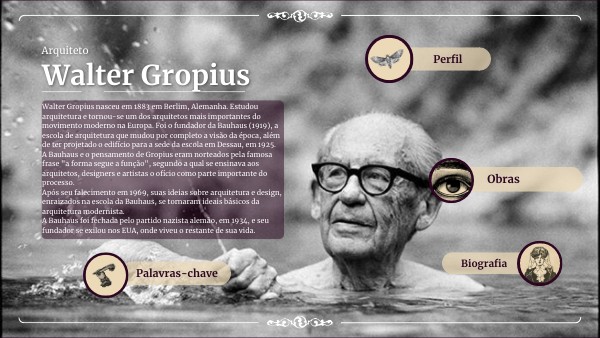 Walter Gropius nasceu em 1883 em Berlim, Alemanha. Estudou arquitetura e tornou-se um dos arquitetos mais importantes do movimento moderno na Europa. Foi o fundador da Bauhaus (1919), a escola de arquitetura que mudou por completo a visão da época, além de ter projetado o edifício para a sede da escola em Dessau, em 1925. A Bauhaus e o pensamento de Gropius eram norteados pela famosa frase "a forma segue a função", segundo a qual se ensinava aos arquitetos, designers e artistas o ofício como parte importante do processo. Após seu falecimento em 1969, suas ideias sobre arquitetura e design, enraizados na escola da Bauhaus, se tornaram ideais básicos da arquitetura modernista. A Bauhaus foi fechada pelo partido nazista alemão, em 1934, e seu fundador se exilou nos EUA, onde viveu o restante de sua vida.