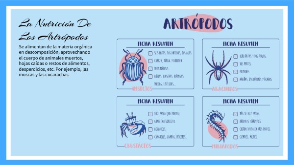 1. ¿En qué se dividen los artrópodos? 2. El intercambio gaseoso de los crustáceos se realiza a traves de las branquias. (V/F) 3. ¿Cuántas patas tienen los insectos? 4. ¿Qué estructura tienen los artrópodos que les brinda protección? 5. Los arácnidos solo producen ácido úrico. (V/F) 6. ¿De qué se alimentan los aracnidos? ¿Y los crustáceos? 7. ¿Cómo es el sistema circulatorio de los arácnidos? 8. El corazón de los crustaceos puede ser corto y tubular, largo y globular o perderse en muchos grupos. (V/F) 9. ¿A través de qué respiran los arácnidos? 10. Da un ejemplo de cada tipo.