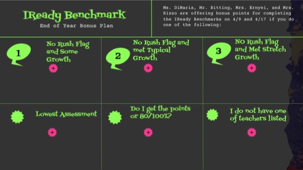 Ms. DiMaria, Mr. Bitting, Mrs. Ernyei, and Mrs. Rizzo are offering bonus points for completing the IReady Benchmarks on 4/9 and 4/17 if you do one of the following: