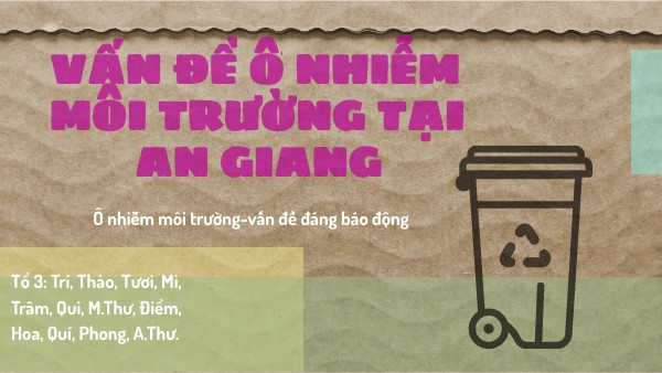 -Hiện nay ở tỉnh An Giang đang chịu nhiều ảnh hưởng của ô nhiễm môi trường, nhất là lượng rác thải và khói bụi.-Các dân cư hầu như không có bãi chứa, xử lý rác thải, không có hệ thống thoát nước và chưa có đội thu gom rác. Nghiêm trọng nhất là người dân không có hệ thống xử lý nước thải sinh hoạt và nước mưa làm ứ đọng, tự thấm vào đất gây mùi hôi, tạo cơ hội cho dịch bệnh phát sinh.