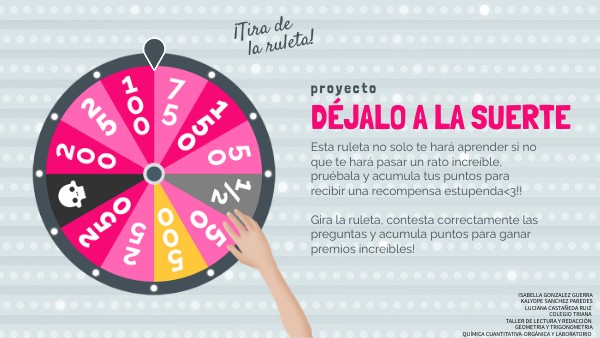 Esta ruleta no solo te hará aprender si no que te hará pasar un rato increíble, pruébala y acumula tus puntos para recibir una recompensa estupenda<3!!Gira la ruleta, contesta correctamente las preguntas y acumula puntos para ganar premios increíbles!