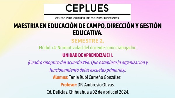 Módulo 4: Normatividad del docente como trabajador.UNIDAD DE APRENDIZAJE II. (Cuadro sinóptico del acuerdo #96: Que establece la organización y funcionamiento delas escuelas primarias). Alumna: Tania Rubí Carreño González. Profesor: DR. Ambrosio Olivas. Cd. Delicias, Chihuahua a 02 de abril del 2024.