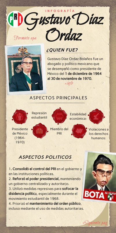 1. Consolidó el control del PRI en el gobierno y en las instituciones políticas. 2. Reforzó el poder presidencial, manteniendo un gobierno centralizado y autoritario. 3. Utilizó medidas represivas para sofocar la disidencia política, especialmente durante el movimiento estudiantil de 1968. 4. Priorizó el mantenimiento del orden público, incluso mediante el uso de medidas autoritarias.