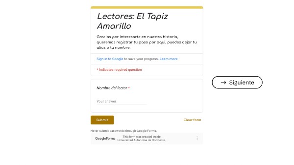 Jenny no sabía que cuidados debería tener, tenía miedo de tocar a su bebe y lastimarlo, sentía que era frágil, y el llanto que este emitía era ensordecedor para sus oídos, no lo soportaba, se angustiaba y perdía la calma. El tapiz de su habitación era su único consuelo, sentía seguridad y calma cuando estaba ahí, pero algo empezó a perturbar su mente, al ver el tapiz recordaba las desdichas de su pasado, el remordimiento de no haber vivido la vida soñada de sus padres, el alejarse de ellos, y lo más importante era el bloqueo mental que tenía el día de esa fiesta que cambió su vida, no recordaba absolutamente nada pero por alguna razón la frase “Todo es culpa de Jhon” era algo que siempre escuchaba al salir de la habitación. La verdad era que Jenny no soportaba a su bebe, no sentía la capacidad de quererlo, oírlo llorar era su peor castigo, ella no amaba a Jhon, se casó con él sin pensarlo bien, nada estaba bien con Jenny y su ‘familia’. La ansiedad llevó a enloquecerla y a caer en una tristeza profunda. Depresión de la cual difícilmente podría salir. Lo que ella no sabía era que el tapiz no hablaba con ella, eran voces en su cabeza, se apegó a el debido a que sin saberlo el color se relacionaba con el color de su vestido el día de la fiesta “amarillo”, era su subconciente que le gritaba que si intenta recordar bien las cosas sabría la verdad, las respuestas las tenía ella en su mente, solo tenía que ‘desbloquearlas’ tarea que no logró incluso con el paso de los años. ¿FIN?...