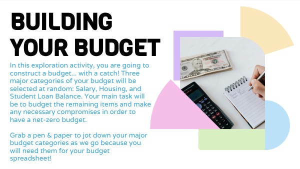 In this exploration activity, you are going to construct a budget... with a catch! Three major categories of your budget will be selected at random: Salary, Housing, and Student Loan Balance. Your main task will be to budget the remaining items and make any necessary compromises in order to have a net-zero budget. Grab a pen & paper to jot down your major budget categories as we go because you will need them for your budget spreadsheet!