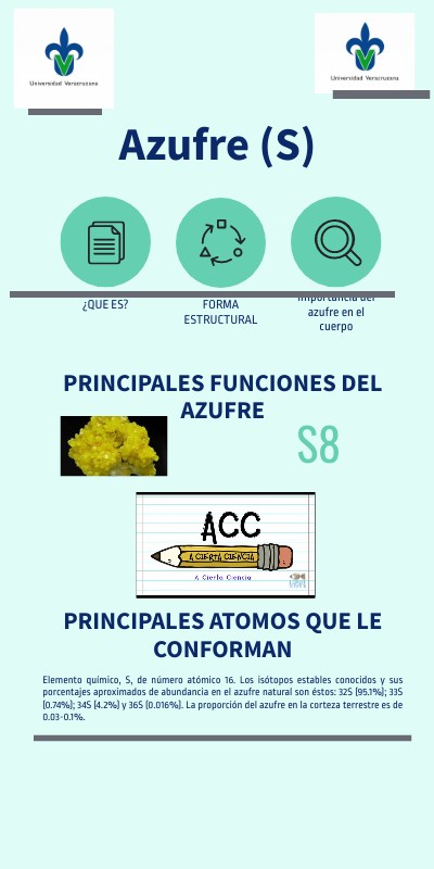 El azufre es un elemento químico con número atómico 16 y de símbolo S. Se encuentra ubicado enabla periódica dentro del grupo de no metales, presenta color amarillo y es bastante abundante en zonas volcánicas de la Tierra