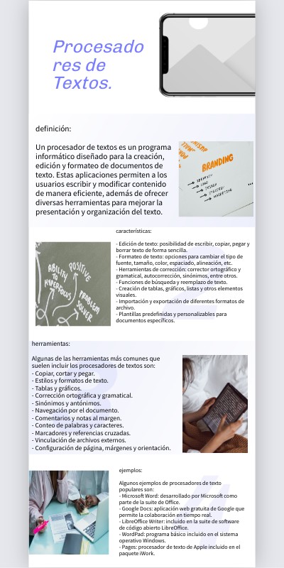 ejemplos: Algunos ejemplos de procesadores de texto populares son: - Microsoft Word: desarrollado por Microsoft como parte de la suite de Office. - Google Docs: aplicación web gratuita de Google que permite la colaboración en tiempo real. - LibreOffice Writer: incluido en la suite de software de código abierto LibreOffice. - WordPad: programa básico incluido en el sistema operativo Windows. - Pages: procesador de texto de Apple incluido en el paquete iWork.