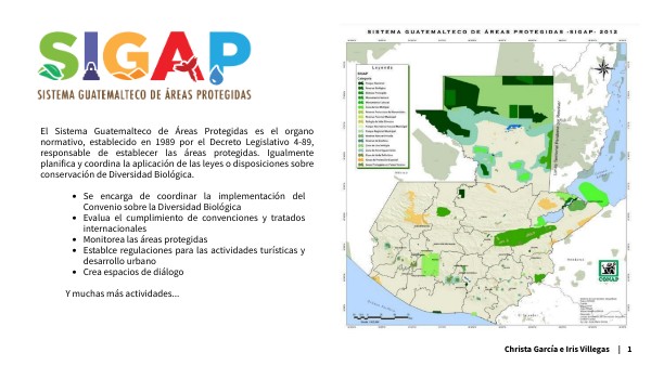 El Sistema Guatemalteco de Áreas Protegidas es el organo normativo, establecido en 1989 por el Decreto Legislativo 4-89, responsable de establecer las áreas protegidas. Igualmente planifica y coordina la aplicación de las leyes o disposiciones sobre conservación de Diversidad Biológica.
