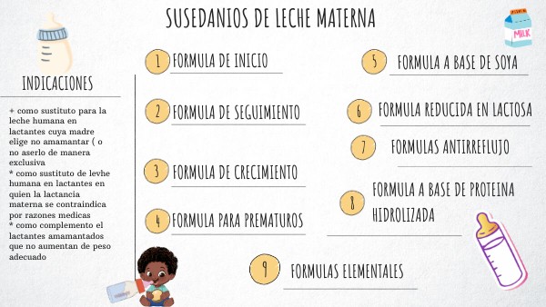 + como sustituto para la leche humana en lactantes cuya madre elige no amamantar ( o no aserlo de manera exclusiva * como sustituto de levhe humana en lactantes en quien la lactancia materna se contraindica por razones medicas * como complemento el lactantes amamantados que no aumentan de peso adecuado