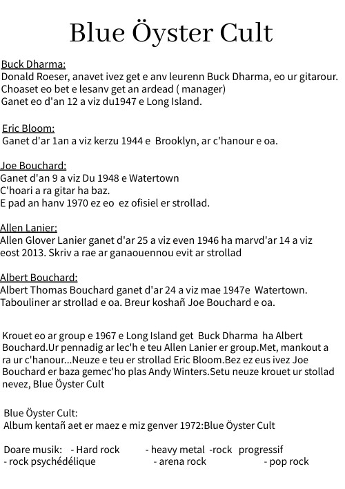 Blue Öyster Cult: Album kentañ aet er maez e miz genver 1972:Blue Öyster Cult Doare musik: - Hard rock - heavy metal -rock progressif - rock psychédélique - arena rock - pop rock