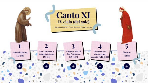"L'un fu tutto serafico in ardore;l'altro per sapienza in terra fuedi cherubica luce uno splendore.De l'un dirò, però che d'amenduesi dice l'un pregiando, qual ch'om prende,perch' ad un fine fur l'opere sue." (vv. 37 - 42)