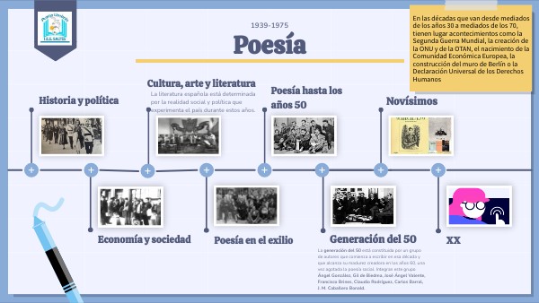 La poesía de posguerra participa del proceso de rehumanización iniciado por los autores de la generación del 27. Hasta los años 50 se observan varias tendencias poéticas, que suponen diversas formas de hacer frente a las secuelas de la guerra civil: la poesía arraigada, la poesía desarraigada y la poesía social.