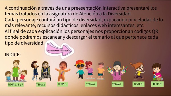 A continuación a través de una preesentación interactiva presentaré los temas tratados en la asignatura de Atención a la Diversidad. Cada personaje contará un tipo de diversidad, explicando pinceladas de lo más relevante, recursos didácticos, enlaces web interesantes, etc. Al final de cada explicación los personajes nos proporcionan codigos QR donde podremos escanear y descargar el temario al que pertenece cada tipo de diversidad. INDICE: