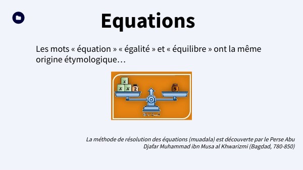 La méthode de résolution des équations (muadala) est découverte par le Perse Abu Djafar Muhammad ibn Musa al Khwarizmi (Bagdad, 780-850)