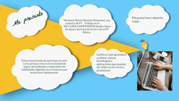 Me llamo Nisrin Mustafa Mohamed, soy maestra de PT . Trabajo en el IES CLARA CAMPOAMOR dando clases de apoyo alumnos de la eso y de la FP Básica.