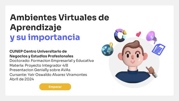 CUNEP Centro Universitario de Negocios y Estudios Profesionales Doctorado: Formacion Empresarial y Educativa Materia: Proyecto Integrador 4/8 Presentacion Genially sobre AVAs Cursante: Yair Oswaldo Alvarez Viramontes Abril de 2024