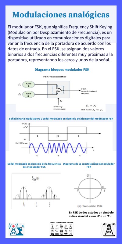 El modulador FSK, que significa Frequency Shift Keying (Modulación por Desplazamiento de Frecuencia), es un dispositivo utilizado en comunicaciones digitales para variar la frecuencia de la portadora de acuerdo con los datos de entrada. En el FSK, se asignan dos valores binarios a dos frecuencias diferentes muy próximas a la portadora, representando los ceros y unos de la señal.