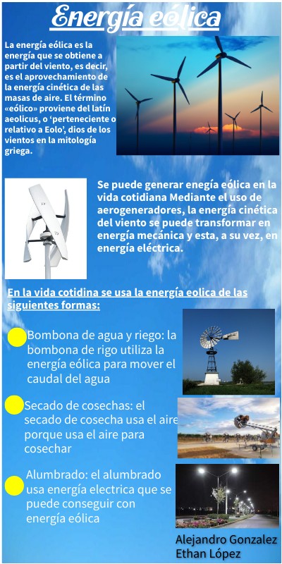 La energía eólica es la energía que se obtiene a partir del viento, es decir, es el aprovechamiento de la energía cinética de las masas de aire. El término «eólico» proviene del latín aeolicus, o ‘perteneciente o relativo a Eolo’, dios de los vientos en la mitología griega.