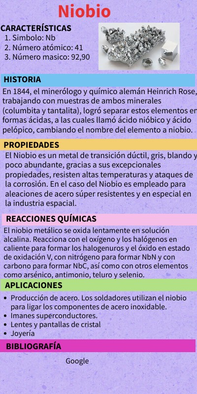 Símbolo: NbNúmero atómico: 41 Número masico: 92,90