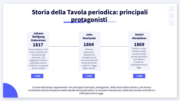 La linea del tempo rappresenta i tre principali scienziati, protagonisti della storia della chimica, che hanno contribuito alla formulazione della attuale tavola periodica, la versione ritenuta più valida dal mondo scientifico e utilizzata ancora oggi.