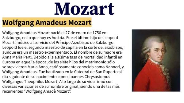 Wolfgang Amadeus Mozart nació el 27 de enero de 1756 en Salzburgo, en lo que hoy es Austria. Fue el último hijo de Leopold Mozart, músico al servicio del Príncipe Arzobispo de Salzburgo. Leopold fue el segundo maestro de capilla en la corte del arzobispo, aunque era un maestro experimentado. El nombre de su madre era Anna María Pertl. Debido a la altísima tasa de mortalidad infantil en Europa en aquella época, de los siete hijos del matrimonio sólo sobrevivieron Maria Anna, cariñosamente conocida como Nannerl, y Wolfgang Amadeus. Fue bautizado en la Catedral de San Ruperto al día siguiente de su nacimiento como Joannes Chrysostomus Wolfgangus Theophilus Mozart; A lo largo de su vida firmó con diversas variaciones de su nombre original, siendo una de las más recurrentes “Wolfgang Amadè Mozart”.