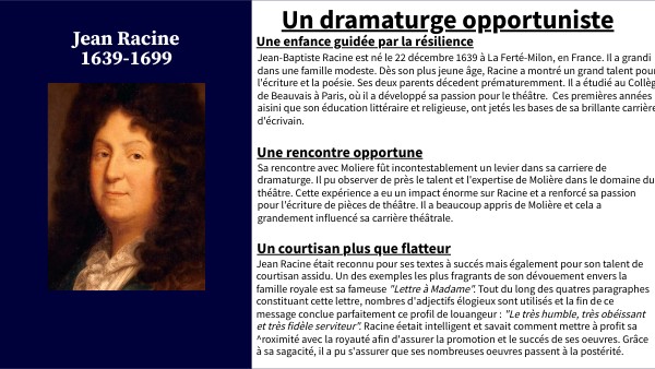 Jean Racine était reconnu pour ses textes à succés mais également pour son talent de courtisan assidu. Un des exemples les plus fragrants de son dévouement envers la famille royale est sa fameuse "Lettre à Madame". Tout du long des quatres paragraphes constituant cette lettre, nombres d'adjectifs élogieux sont utilisés et la fin de ce message conclue parfaitement ce profil de louangeur : "Le très humble, très obéissant et très fidèle serviteur". Racine éetait intelligent et savait comment mettre à profit sa ^roximité avec la royauté afin d'assurer la promotion et le succés de ses oeuvres. Grâce à sa sagacité, il a pu s'assurer que ses nombreuses oeuvres passent à la postérité.