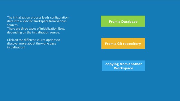 The initialization process loads configuration data into a specific Workspace from various sources. There are three types of initialization flow, depending on the initialization source. Click on the different source options to discover more about the workspace initialization!