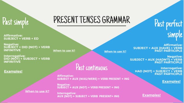 Affirmative:SUBJECT + VERB + ED Negative: SUBJECT + DID (NOT) + VERB INFINITIVE Interrogative: DID (NOT) + SUBJECT + VERB INFINITIVE