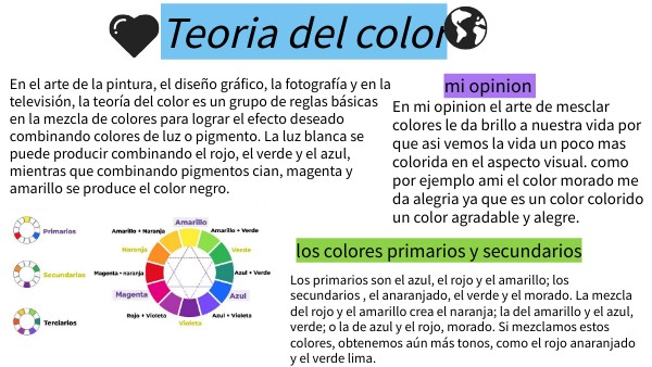 En mi opinion el arte de mesclar colores le da brillo a nuestra vida por que asi vemos la vida un poco mas colorida en el aspecto visual. como por ejemplo ami el color morado me da alegria ya que es un color colorido un color agradable y alegre.