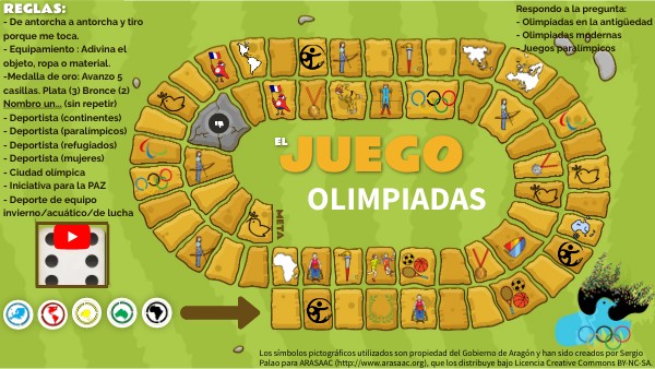 - De antorcha a antorcha y tiro porque me toca.- Equipamiento : Adivina el objeto, ropa o material.-Medalla de oro: Avanzo 5 casillas. Plata (3) Bronce (2) Nombro un... (sin repetir) - Deportista (continentes) - Deportista (paralímpicos) - Deportista (refugiados) - Deportista (mujeres) - Ciudad olímpica - Iniciativa para la PAZ - Deporte de equipo invierno/acuático/de lucha