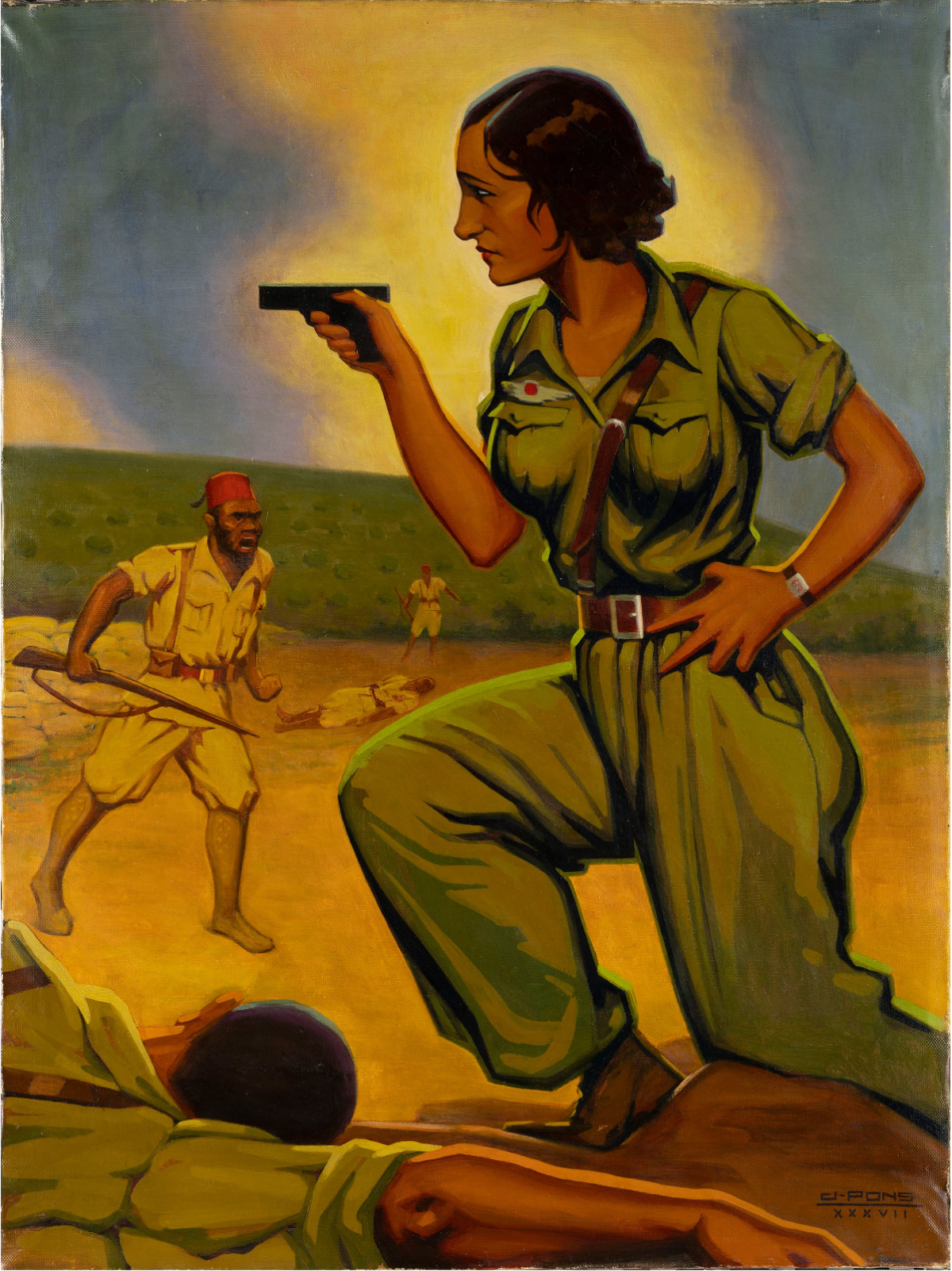 La joven Paulina Ódena García (Barcelona, 1911 – Granada, 1936), nacida en el pasaje de Pellicer de Barcelona, se alistó como voluntaria en la Guerra Civil, que la pilló en Andalucía. Se unió a una columna integrada, sobre todo, por soldados de la aviación procedentes de la base aérea de Armilla. Ódena, a pesar de su juventud, estaba plenamente activa en política desde hacía unos años y era militante del partido comunista. Tomó las armas durante el levantamiento de octubre de 1934 y, con motivo de las elecciones generales de 1936 que ganaría el Frente Popular, acompañó a Dolores Ibárruri, La Pasionaria, en algunos mítines que dio por el Estado. El 14 de septiembre de 1936 —no hacía ni dos meses que había empezado la guerra—, cuando circulaba en coche a la altura del pantano de Cubillas, cerca de Granada, su chófer se dirigió hacia un control del ejército. Cuando estaban a punto de tomar contacto se dieron cuenta de que eran soldados falangistas; fatalmente se habían equivocado de camino. Intentaron huir, pero era demasiado tarde. Al sentirse a punto de ser apresada, y sabiendo perfectamente lo que le esperaba, la joven miliciana se disparó en la cabeza. Tenía solo 24 años. No fue una muerte ni mucho menos anónima. El diario Ideal de Granada enseguida se hizo eco de la noticia, e incluso publicó la fotografía del coche en el que viajaba la joven con el rótulo de El Mundo Obrero y, en el lateral, las iniciales “U. H. P.” (sigla de la expresión “Uníos hermanos proletarios”). Su condición de mujer y joven fallecida en la guerra fue utilizada como elemento de propaganda. Se realizaron tarjetas con su efigie, calendarios y sellos, e incluso se creó un batallón integrado únicamente por mujeres con el nombre de Batallón Lina Ódena. Pero es menos conocido que su memoria estuvo presente ni más ni menos que en el pabellón español de la Exposición Universal de París de 1937, más conocido como Pabellón de la República.