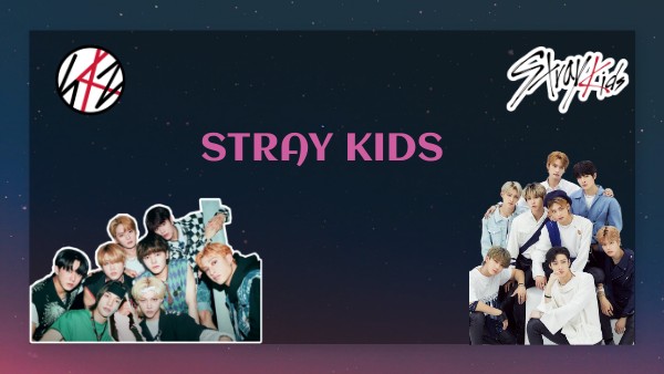 Es un grupo masculino surcoreano formado en 2017 por JYP Entertainment a través de un programa de supervivencia y compuesto por 8 miembros. Debutaron el 25 de marzo del 2018 y desde entonces han ganado 79 premios. El primero fue el 04/04/2019. Antes eran 9 intengrantes pero por motivos desconocidos Woojin abandonó el grupo en octubre del 2019. El 1 de agosto es el aniversario de su fandom, cuyo nombre es Stay. Su lema es ``Stray Kids Everywhere all Around the World´´ y ``You make Stray Kids Stay´´ Ha sido el primer grupo en elegir a sus miembros y en componer y producir sus canciones.