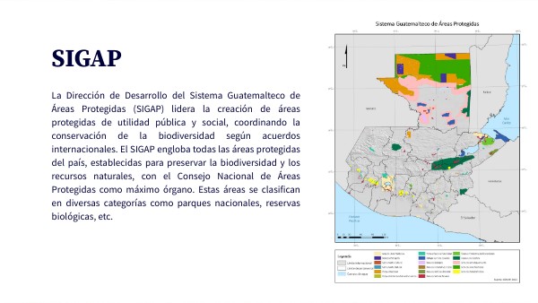 La Dirección de Desarrollo del Sistema Guatemalteco de Áreas Protegidas (SIGAP) lidera la creación de áreas protegidas de utilidad pública y social, coordinando la conservación de la biodiversidad según acuerdos internacionales. El SIGAP engloba todas las áreas protegidas del país, establecidas para preservar la biodiversidad y los recursos naturales, con el Consejo Nacional de Áreas Protegidas como máximo órgano. Estas áreas se clasifican en diversas categorías como parques nacionales, reservas biológicas, etc.