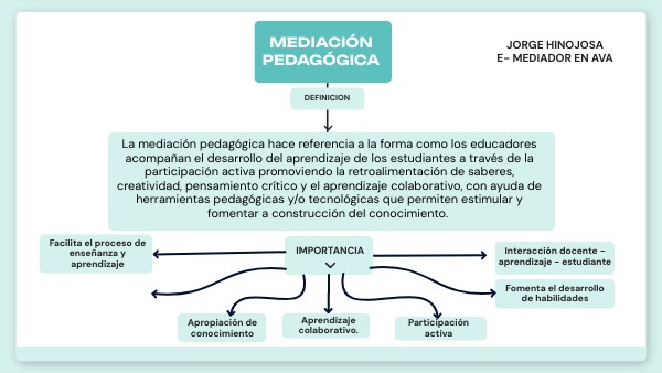 La mediación pedagógica hace referencia a la forma como los educadores acompañan el desarrollo del aprendizaje de los estudiantes a través de la participación activa promoviendo la retroalimentación de saberes, creatividad, pensamiento crítico y el aprendizaje colaborativo, con ayuda de herramientas pedagógicas y/o tecnológicas que permiten estimular y fomentar a construcción del conocimiento.