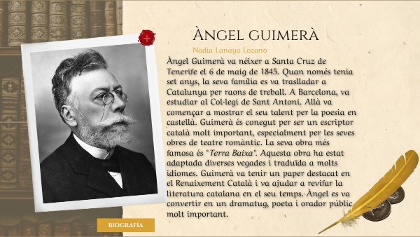 Àngel Guimerà va néixer a Santa Cruz de Tenerife el 6 de maig de 1845. Quan només tenia set anys, la seva família es va traslladar a Catalunya per raons de treball. A Barcelona, va estudiar al Col·legi de Sant Antoni. Allà va començar a mostrar el seu talent per la poesia en castellà. Guimerà és conegut per ser un escriptor català molt important, especialment per les seves obres de teatre romàntic. La seva obra més famosa és "Terra Baixa". Aquesta obra ha estat adaptada diverses vegades i traduïda a molts idiomes. Guimerà va tenir un paper destacat en el Renaixement Català i va ajudar a revifar la literatura catalana en el seu temps. Àngel es va convertir en un dramatug, poeta i orador públic molt important. https://www.escriptors.cat/autors/guimeraa/biografia-angel-guimera
