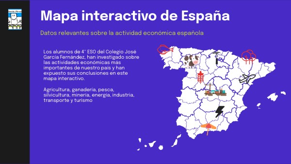 Los alumnos de 4º ESO del Colegio José García Fernández, han investigado sobre las actividades económicas más importantes de nuestro país y han expuesto sus conclusiones en este mapa interactivo. Agricultura, ganadería, pesca, silvicultura, minería, energía, industria, transporte y turismo