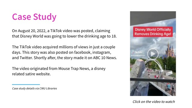 On August 20, 2022, a TikTok video was posted, claiming that Disney World was going to lower the drinking age to 18. The TikTok video acquired millions of views in just a couple days. This story was also posted on facebook, instagram, and Twitter. Shortly after, the story made it on ABC 10 News. The video originated from Mouse Trap News, a disney related satire website.