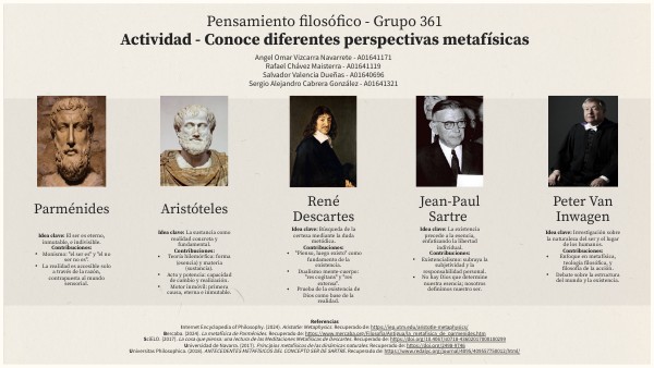 ReferenciasInternet Encyclopedia of Philosophy. (2024). Aristotle: Metaphysics. Recuperado de: https://iep.utm.edu/aristotle-metaphysics/ Bercaba. (2024). La metafísica de Parménides. Recuperado de: https://www.mercaba.org/Filosofia/Antigua/la_metafisica_de_parmenides.htm SciELO. (2017). La cosa que piensa: una lectura de las Meditaciones Metafísicas de Descartes. Recuperado de: https://doi.org/10.4067/s0718-43602017000100299 Universidad de Navarra. (2017). Principios metafísicos de las dinámicas naturales. Recuperado de: https://doi.org/2498-9746 Universitas Philosophica. (2018). ANTECEDENTES METAFÍSICOS DEL CONCEPTO SER DE SARTRE. Recuperado de: https://www.redalyc.org/journal/4095/409557750012/html/