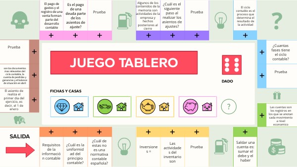 Cada jugador/a debe elegir un color: azul, verde, amarillo o rosa. Así obtiene una ficha para marcar su posición y 10 casas para indicar las propiedades que adquiere a lo largo del juego. Cada jugador debe coger la ficha de su color y colocarla en la casilla de salida. Para empezar a jugar, pincha sobre el dado y mueve tu ficha hasta la casilla que corresponda. En cada casilla debe haber una o varias preguntas. Si la aciertas, coloca una de tus casas en dicha casilla. ¡Enhorabuena, has conseguido una nueva propiedad! Casillas especiales: las casillas con iconos pueden contener sanciones como por ejemplo "El jugador paga impuestos de la luz: pierde 2 casas". ¡Acierta la pregunta para evitar la sanción! Ganará aquel jugador/a que tenga el mayor número de casas sobre el tablero una vez que todas las casillas estén ocupadas.