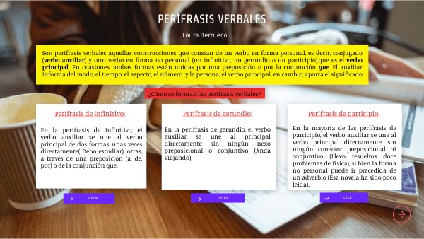 Son perífrasis verbales aquellas construcciones que constan de un verbo en forma personal, es decir, conjugado (verbo auxiliar) y otro verbo en forma no personal (un infinitivo, un gerundio o un participio),que es el verbo principal. En ocasiones, ambas formas están unidas por una preposición o por la conjunción que. El auxiliar informa del modo, el tiempo, el aspecto, el número y la persona; el verbo principal, en cambio, aporta el significado .
