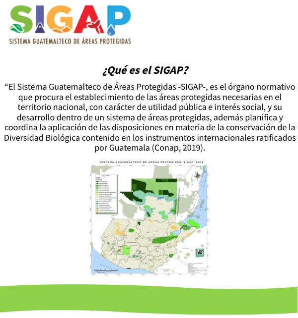 “El Sistema Guatemalteco de Áreas Protegidas -SIGAP-, es el órgano normativo que procura el establecimiento de las áreas protegidas necesarias en el territorio nacional, con carácter de utilidad pública e interés social, y su desarrollo dentro de un sistema de áreas protegidas, además planifica y coordina la aplicación de las disposiciones en materia de la conservación de la Diversidad Biológica contenido en los instrumentos internacionales ratificados por Guatemala (Conap, 2019).