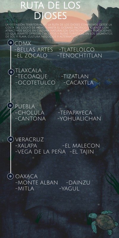 La extensión territorial de la Ruta de los Dioses comprende desde la Costa del Golfo de México hasta el Océano Pacífico, y cuenta con atractivos ricos en cultura, naturaleza, gastronomía y tradiciones, lo que permite ofrecer circuitos y rutas turísticas en los segmentos de sol y playa, cultura, negocios y alternativo.
