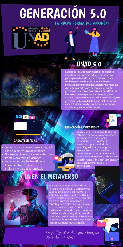 La generación 5.0 se esta volviendo una tendencia importante que podemos definir como un nuevo paradigma en todos los niveles académicos. Cabe resaltar que el detalle principal es que actores involucrados comprendan los aspectos y objetivos que dan la forma a este modo de educar; esta quinta generación en la educación a distancia en la UNAD la cual esta impulsada por los avances tecnológicos actuales. Según Jaime Alberto Leal Afanador (2013), Esta generación se basa en la interacción e interactividad entre estudiantes, medios, mediaciones, mediadores, actividades y evaluación de calidad.