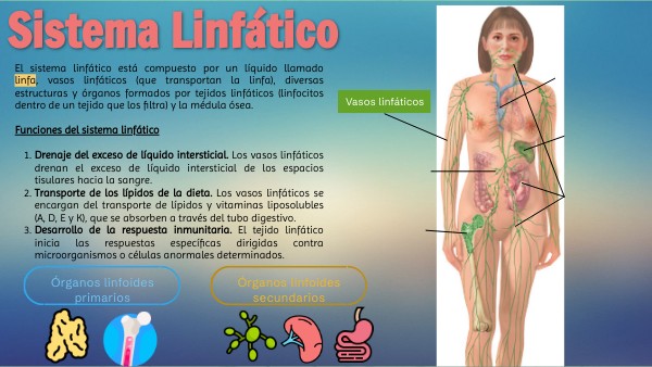 El sistema linfático está compuesto por un líquido llamado linfa, vasos linfáticos (que transportan la linfa), diversas estructuras y órganos formados por tejidos linfáticos (linfocitos dentro de un tejido que los filtra) y la médula ósea. Funciones del sistema linfático