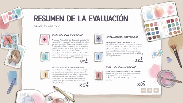 Este componente consta de un oral individual que evalúa internamente el profesor y que modera externamente el IB al final del curso.