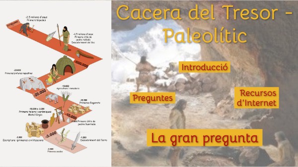 L'objectiu d'aquesta caça del tresor és endinsar-nos en el Paleolític i conèixer-ne el desenvolupament i les formes de vida de la població. Heu de donar resposta a les preguntes numerades després de fer una recerca guiada a Internet. Aquesta cerca es farà utilitzant els Recursos d'Internet que prèviament hem seleccionat els professors, que serviran d'ajut per trobar les respostes a les preguntes plantejades. Finalment respondreu a la Gran pregunta que us permetran aplicar els coneixements adquirits. La recerca d'informació es pot realitzar de manera col·laborativa però la resposta de les preguntes plantejades requereix un treball autònom i individual per part vostra.