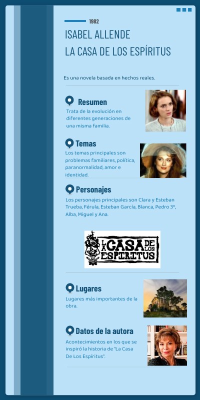 Nació el 2 de agosto de 1942 en Lima (Perú). Es muy reconocida por su obra estrella "La Casa De Los Espíritus", publicada en 1982, fue una gran figura en la literatura latinoamericana, ya que cuenta la dictadura de Augusto Pinochet y el golpe militar de 1973. Fue una obra muy reconocida y una gran parte realista porque hay personajes inventados por ella y elementos paranormales y mágicos por parte de los personajes de Clara y su hija Ana, ya que tienen poderes mágicos, como premoniciones, hablan con espíritus, y cuenta la vida de los personajes y como va evolucionando antes y después de la política. La política va a formar una gran parte de la trama ya que será la razón del futuro de nuestros protagonistas. Usará elemtos de ficcón para atraer a más leectores y que la parte realista de la trama se conozca de verdad.